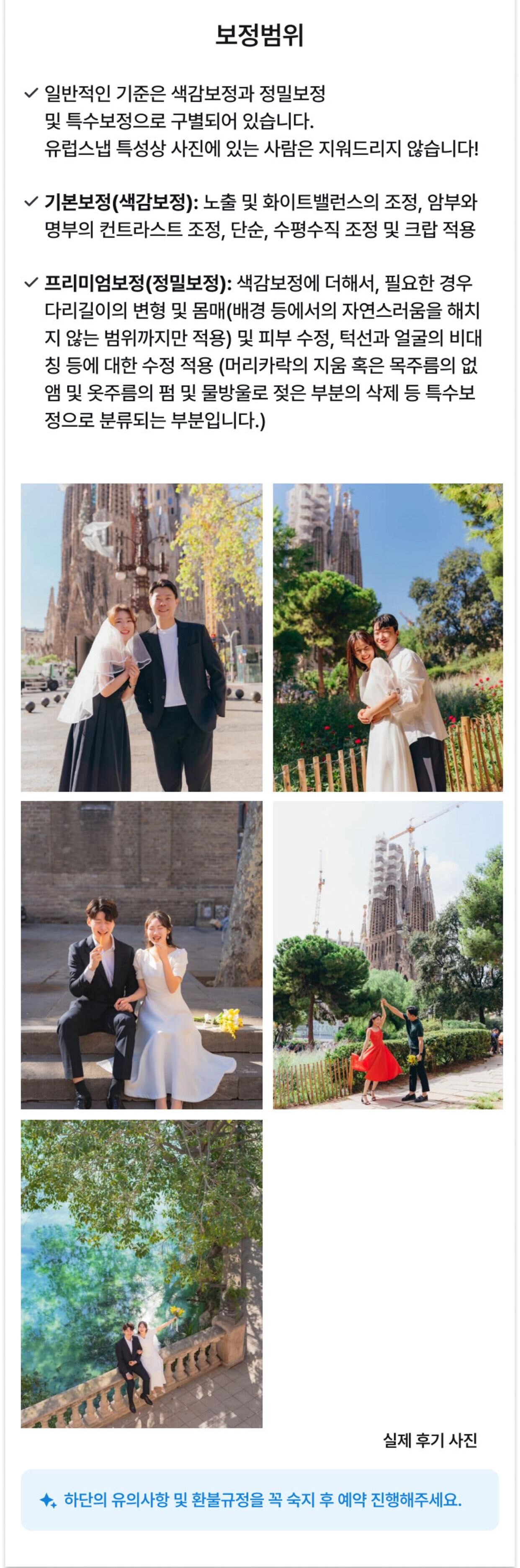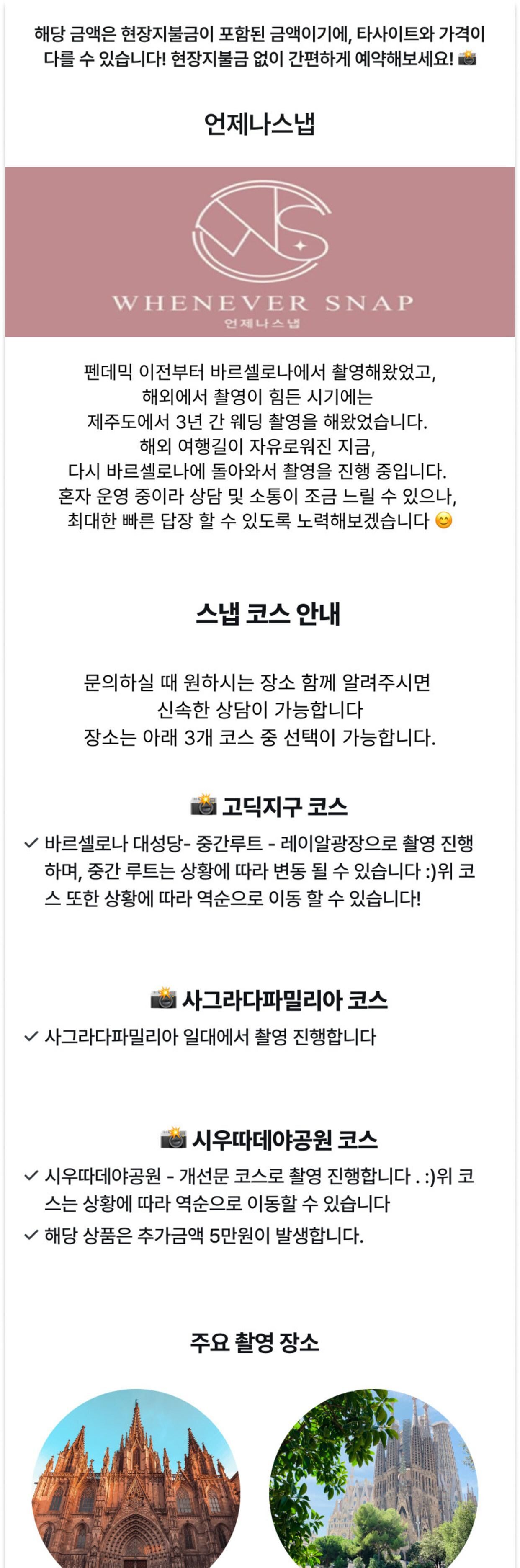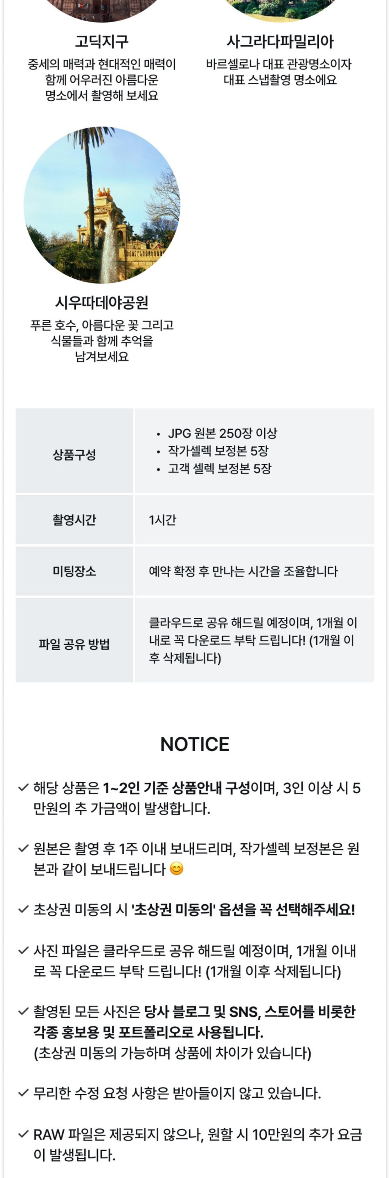 [1시간] 언제나스냅 바르셀로나 스냅 1시간 촬영/ 웨딩 가족 데이트 개인촬영 평점 5 · 리뷰 6건 포함 * JPG 원본 250장 이상+ 작가셀렉 보정본 5장 * 고객 셀렉 보정본 5장 * 클라우드로 공유해 드립니다. * 원본은 최대 2주 이내로 제공되며, 보정본은 사진을 골라주신 날짜 기준으로 최대 3개월 소요됩니다. 불포함 * 추가보정본 - 1장당 5000원 *긴급보정 - 10만원 (고객셀렉본 2주이내 발송 시) 마이리얼트립에서 예약하기 바르셀로나 목록 도시 목록