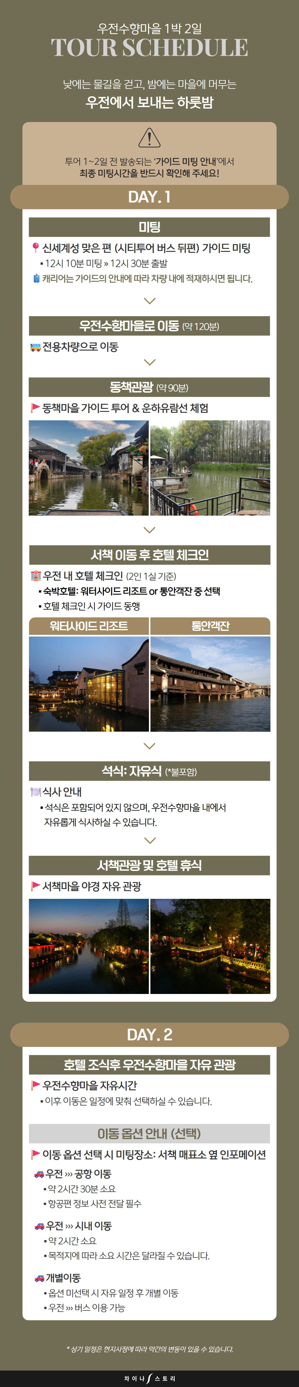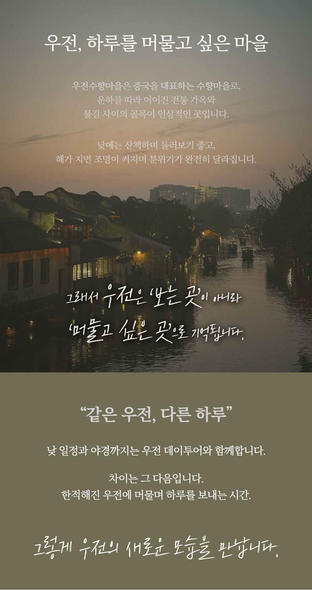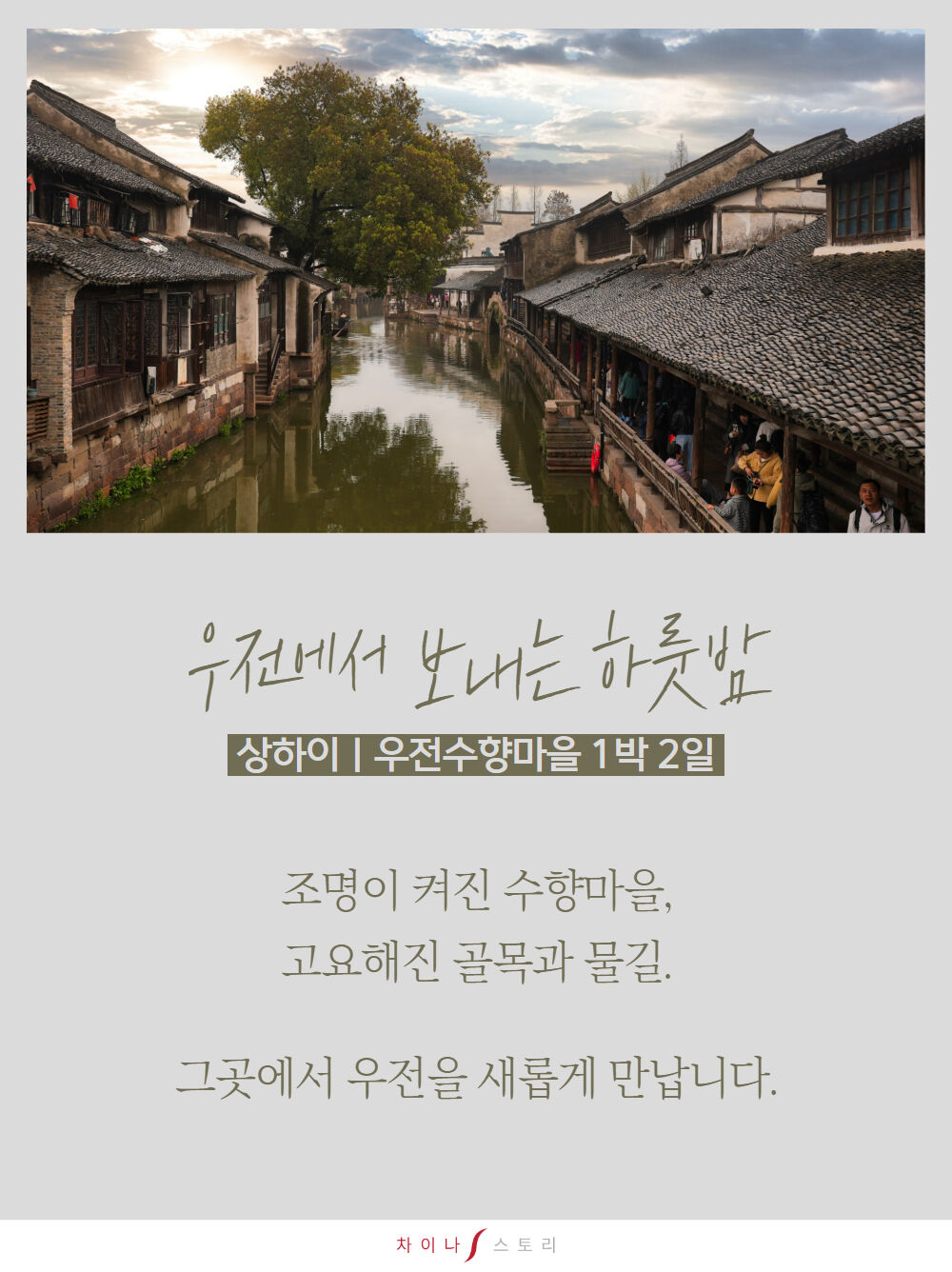 [우전1박2일여행] 상하이근교 우전수향마을 1박2일 투어 - 5성급리조트 한국어가이드 포함 평점 5 · 리뷰 2건 포함 전용차량 한국어 가이드 우전수향마을 동/서책 관광지 입장료 동책코스 나룻배 유람선 우전서책내 5성급호텔 숙박 및 호텔조식 (2인1실기준) 불포함 개인기타 경비 중,석식. 우전에서 복귀 차량(옵션선택 가능) 여행자 보험 마이리얼트립에서 예약하기 상하이 목록 도시 목록