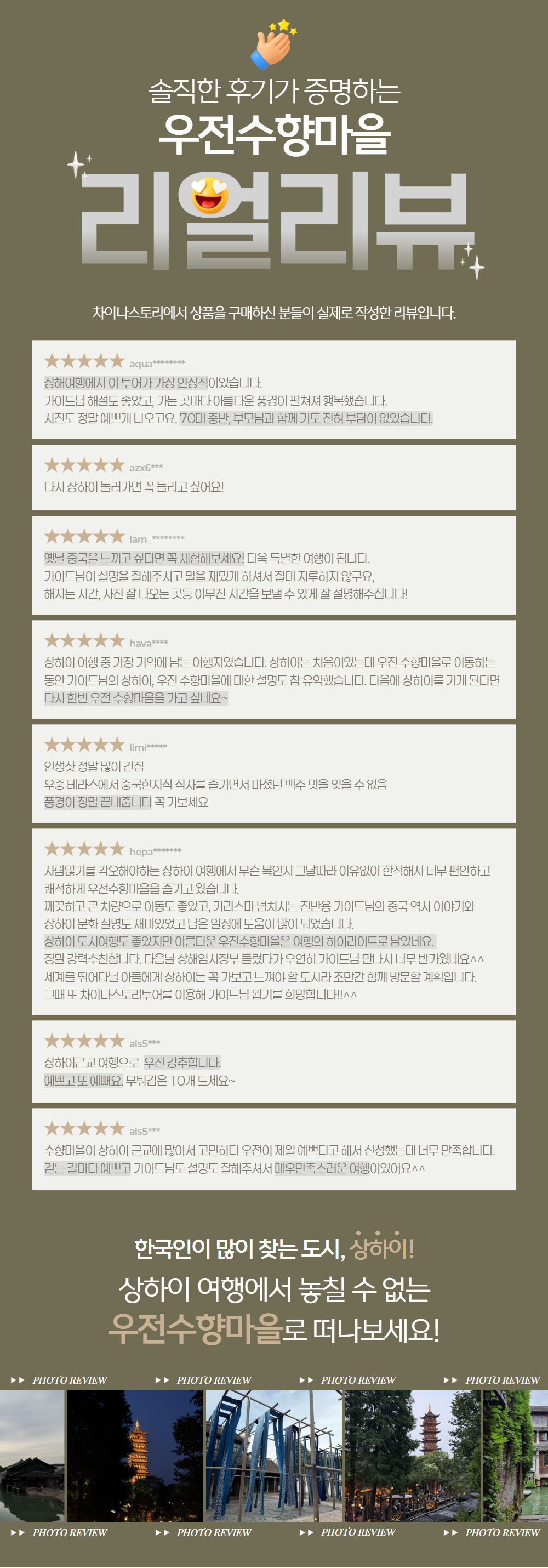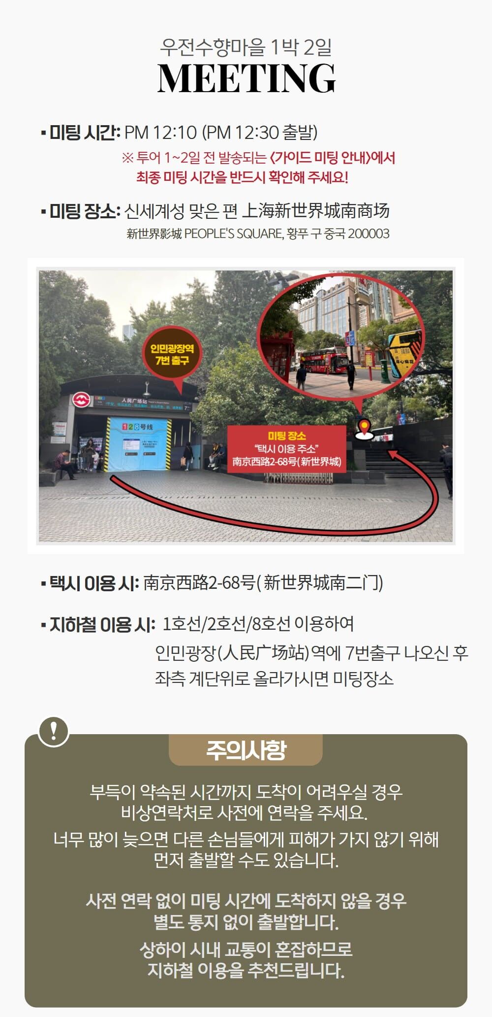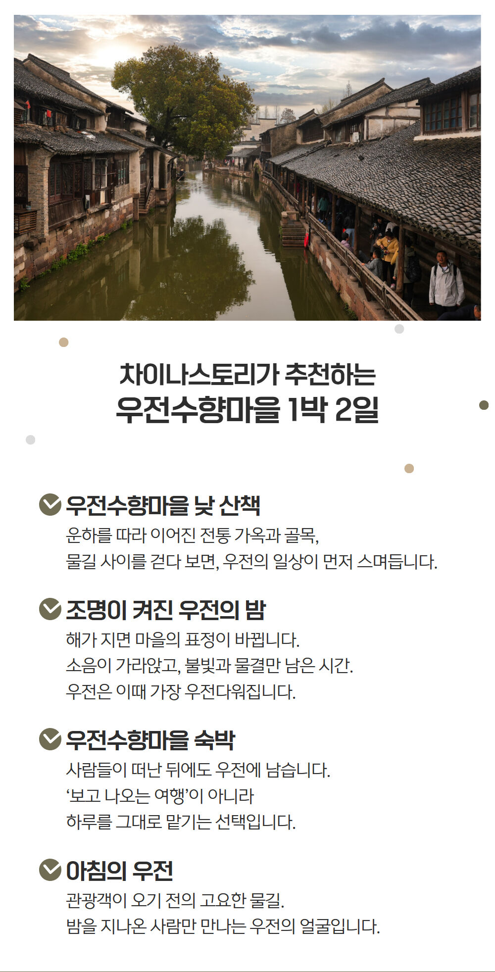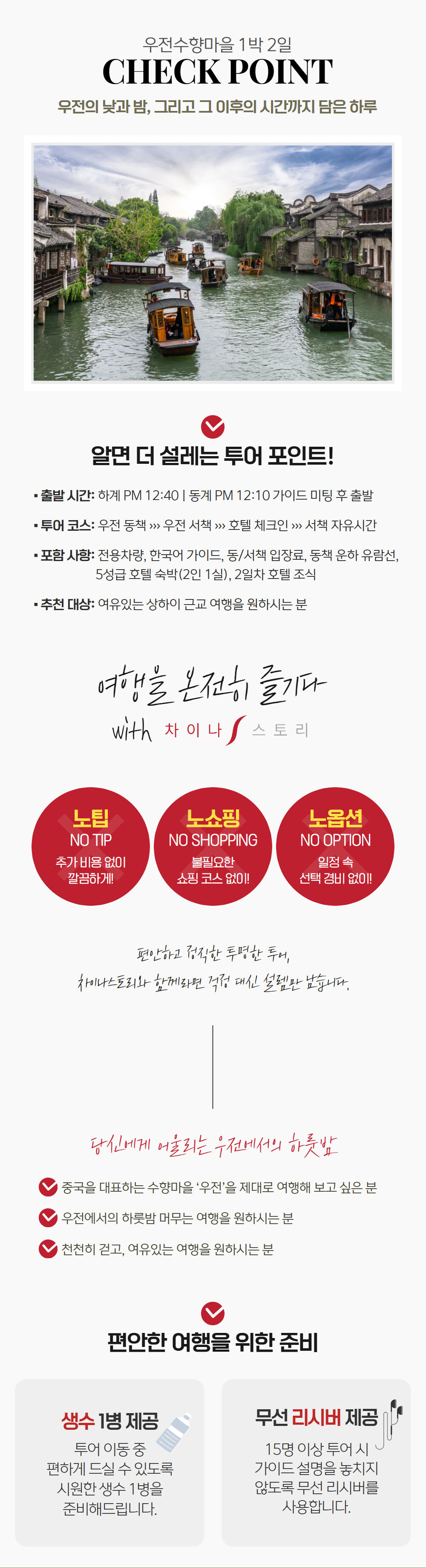 [우전1박2일여행] 상하이근교 우전수향마을 1박2일 투어 - 5성급리조트 한국어가이드 포함 평점 5 · 리뷰 2건 포함 전용차량 한국어 가이드 우전수향마을 동/서책 관광지 입장료 동책코스 나룻배 유람선 우전서책내 5성급호텔 숙박 및 호텔조식 (2인1실기준) 불포함 개인기타 경비 중,석식. 우전에서 복귀 차량(옵션선택 가능) 여행자 보험 마이리얼트립에서 예약하기 상하이 목록 도시 목록