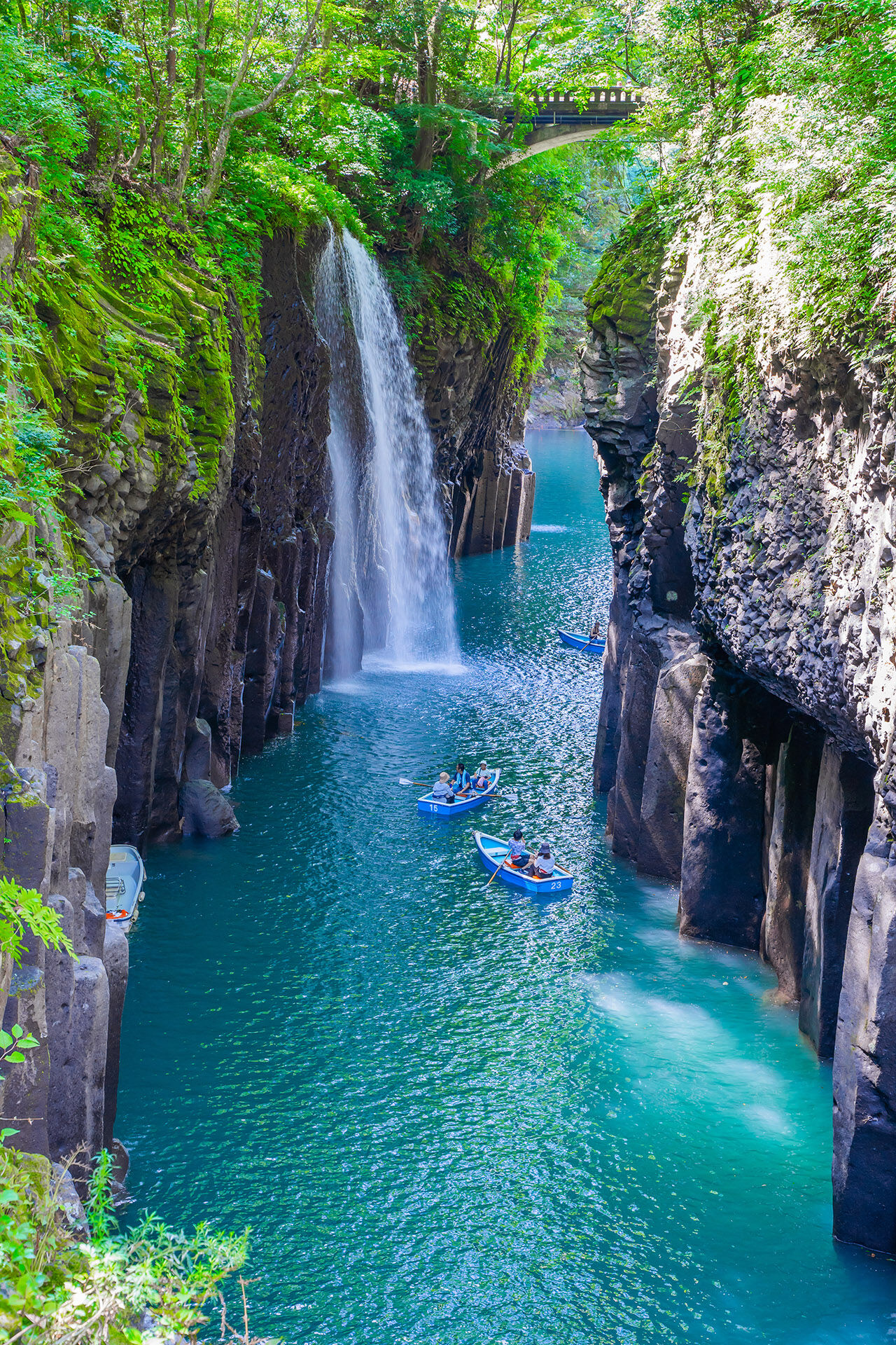 타카치호 협곡은 고대 아소 화산의 분화로 형성된 계곡으로, 양측의 단애와 17m 높이의 마나이 폭포가 특징입니다. 계곡 위로는 세 시대에 걸쳐 건설된 세 개의 아치형 다리가 나란히 서 있어 장관을 이루고 있습니다.