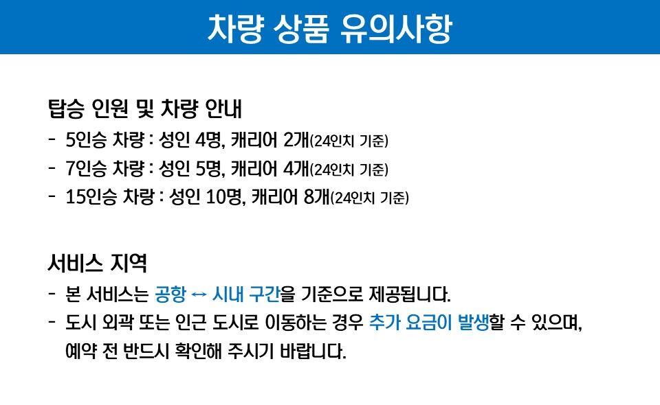 - 1. 여행자 보험 • 여행자 보험은 상품 요금에 포함되어 있지 않습니다 • 안전한 여행을 위해 해외 여행자 보험에 개별 가입하실 것을 권장드립니다 2. 유아 카시트 • 유아용 카시트는 기본 제공되지 않습니다 • 사전 요청 시 제공 가능합니다 (사전 예약 필수) 3. 추가 요금 • 시내 기준 외곽 지역 픽업·샌딩 요청 시 별도의 추가 요금이 부과될 수 있습니다.