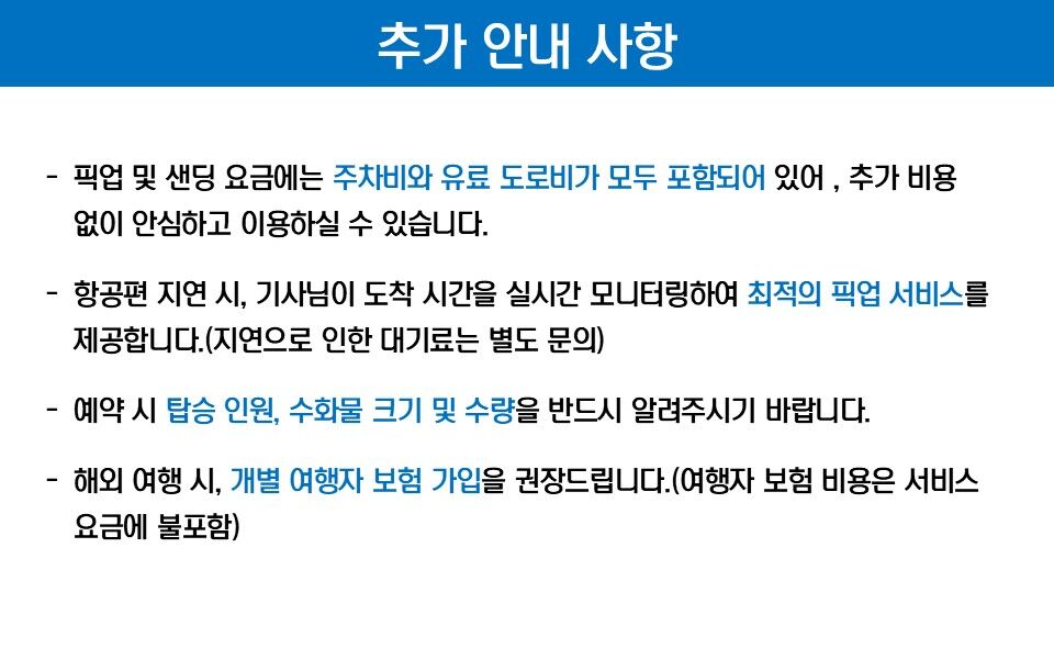 - 1. 차량 서비스 (5인승/7인승/15인승) 2. 공항 픽업&샌딩 서비스 3. 항공편 지연 모니터링 서비스 4. 미팅 포인트 픽업 서비스 5. 주차비와 유료 도로비