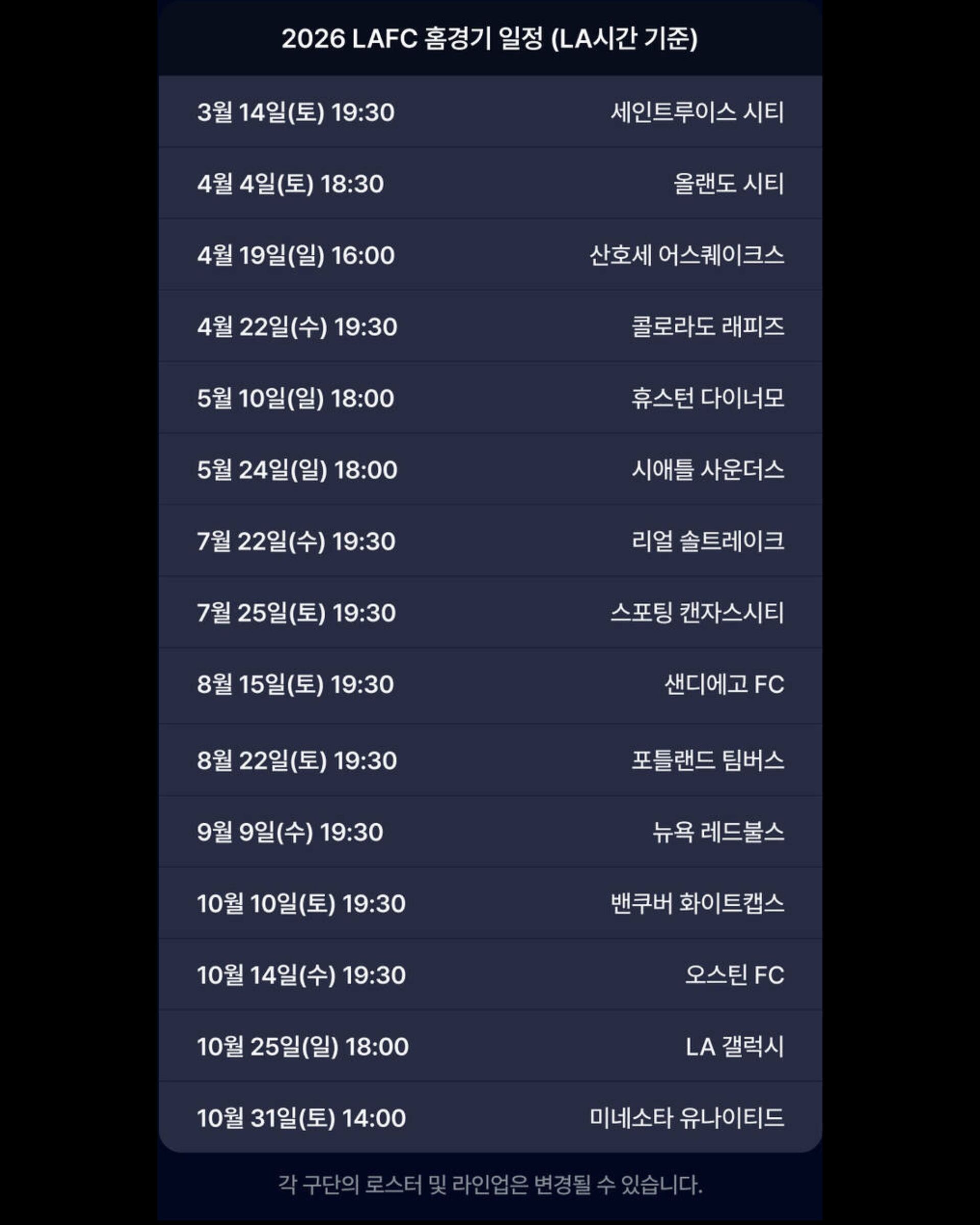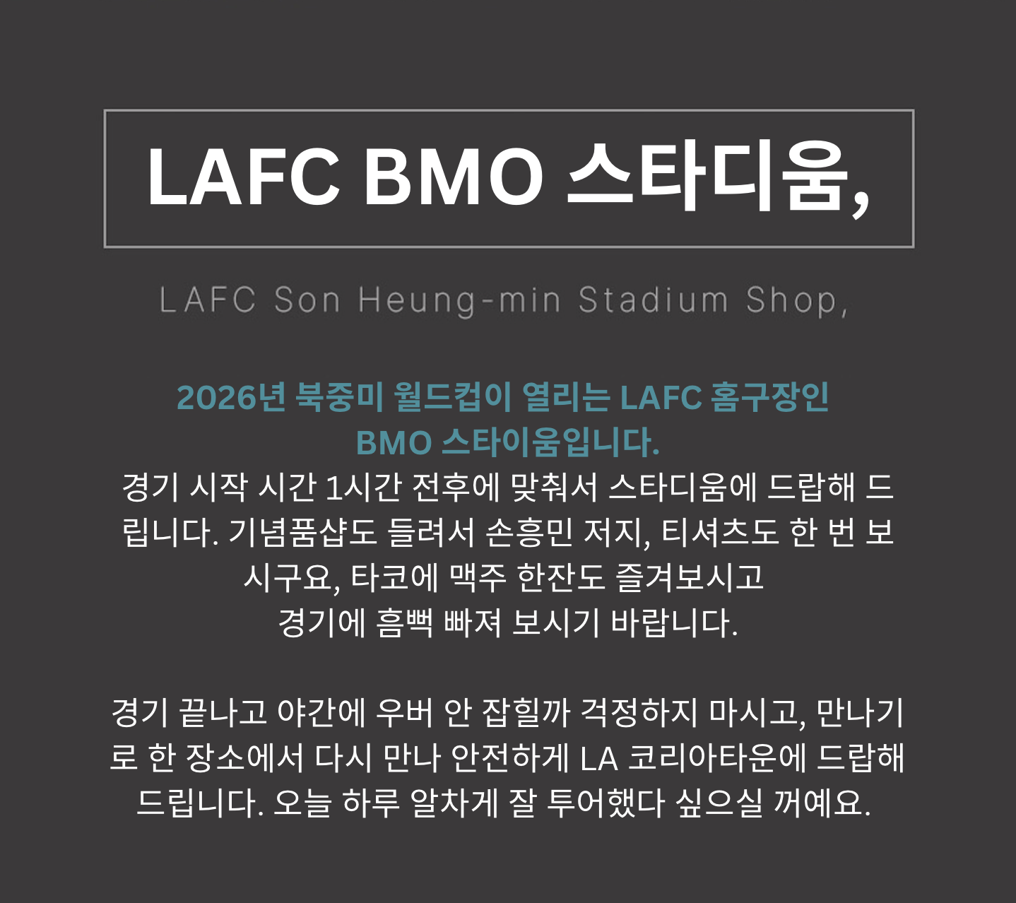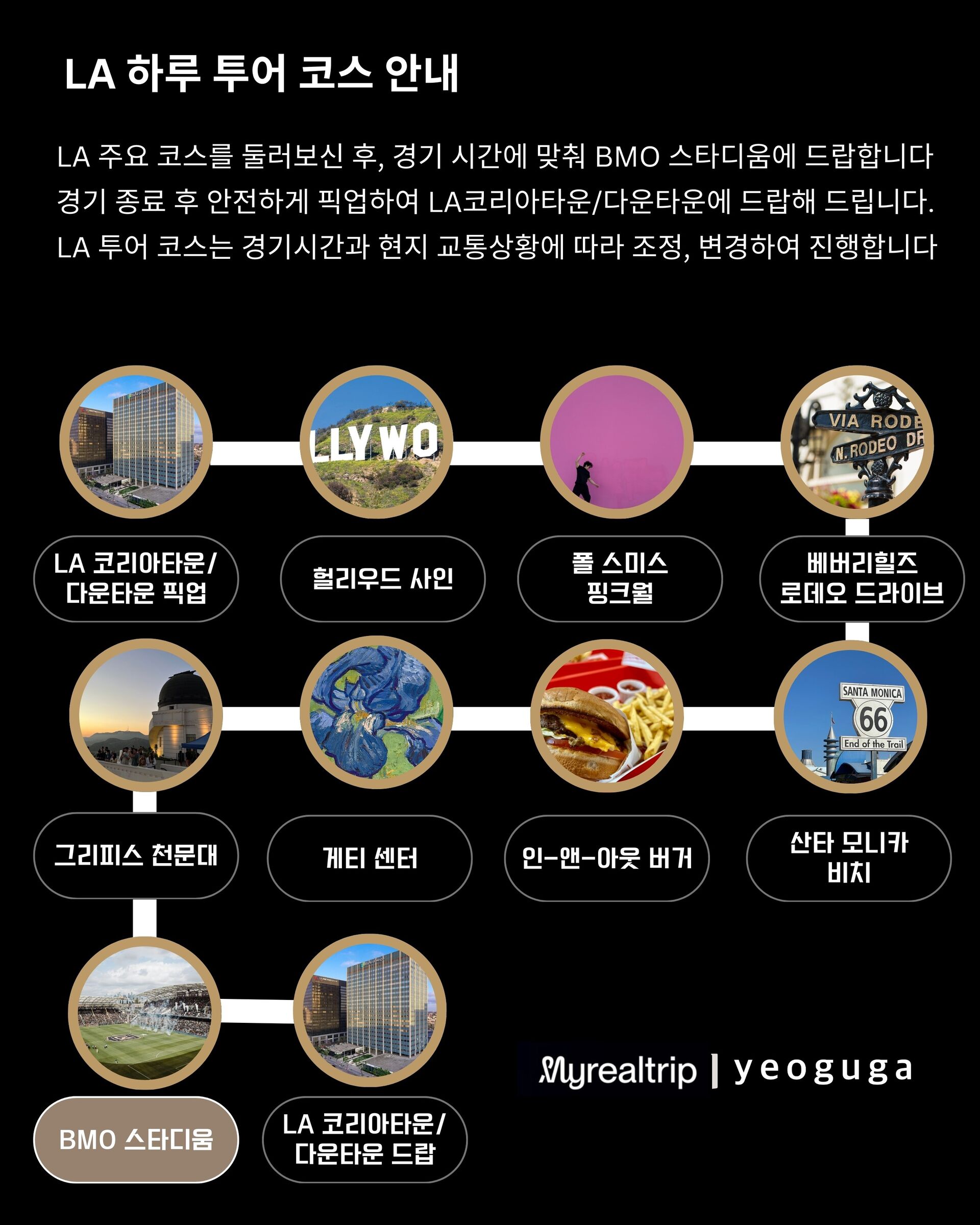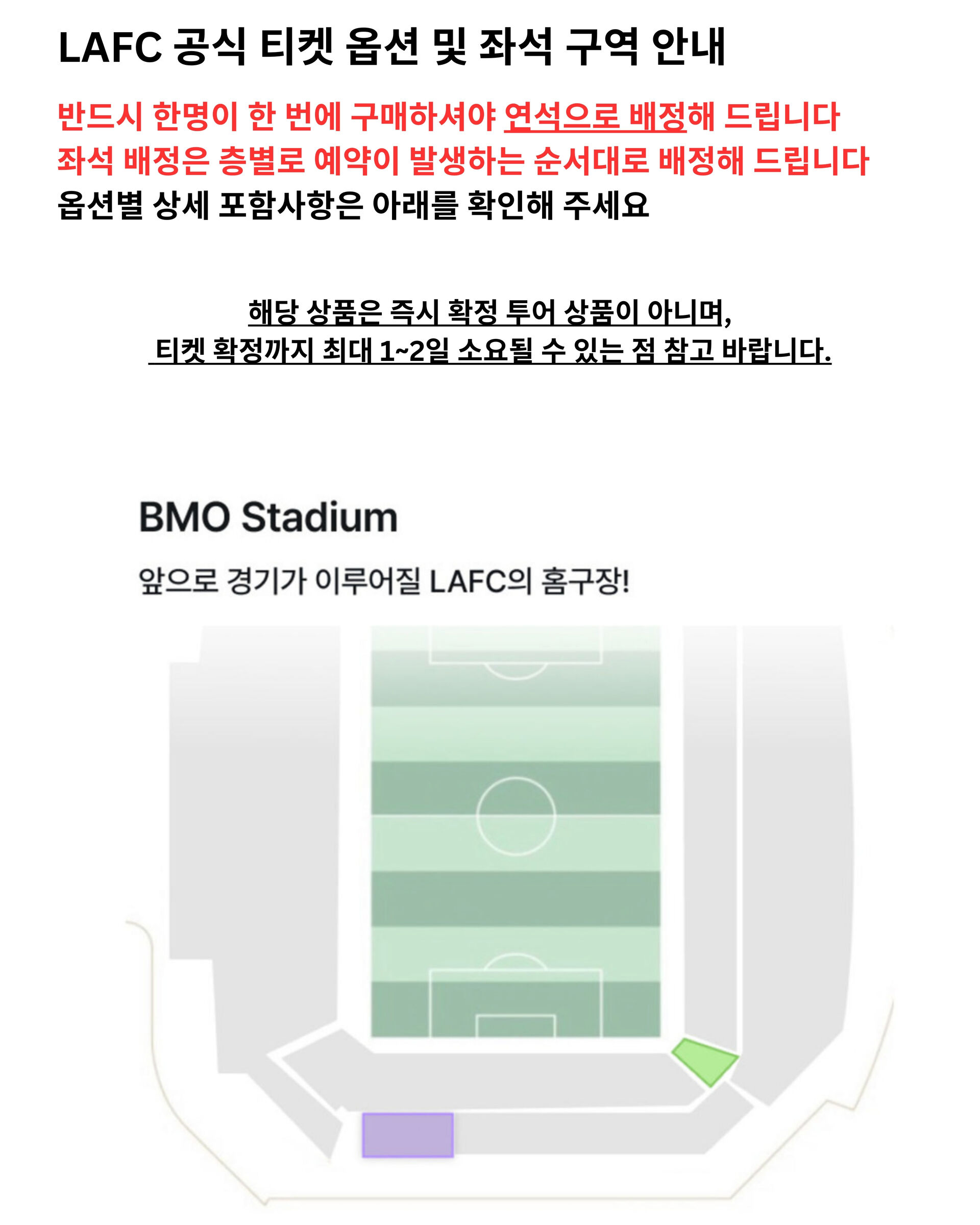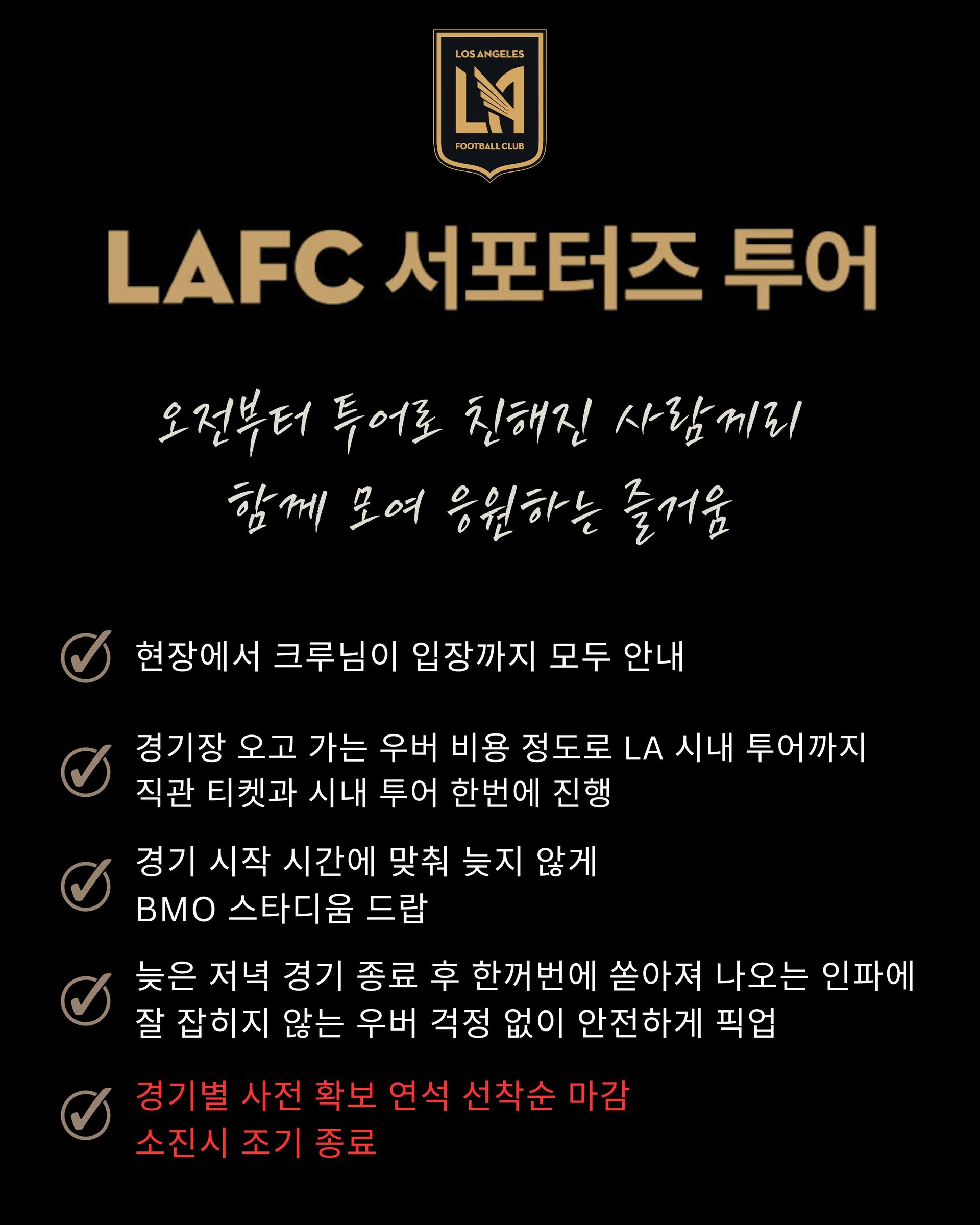 [LAFC 티켓+투어] LA 하루 시내투어 & LAFC 직관 (이동편 제공) 평점 5 · 리뷰 13건 포함 * LAFC 공식 좌석 티켓 * LA 하루 투어 진행 * BMO 스타디움 경기전 드랍, 경기 종료 후 픽업/LA 코리아타운 드랍 * 게티 센터, 헐리우드, 그리피스 천문대 등 주차 & 투어 차량 서비스 불포함 현장 진행 크루 팁 $20/인 각자 인앤아웃 점심 식사비($10-$20) BMO 스타디움 기념품 구매 & 각자 저녁 개인 비용 마이리얼트립에서 예약하기 로스앤젤레스 목록 도시 목록