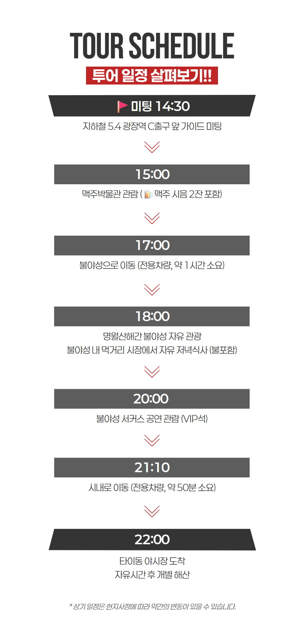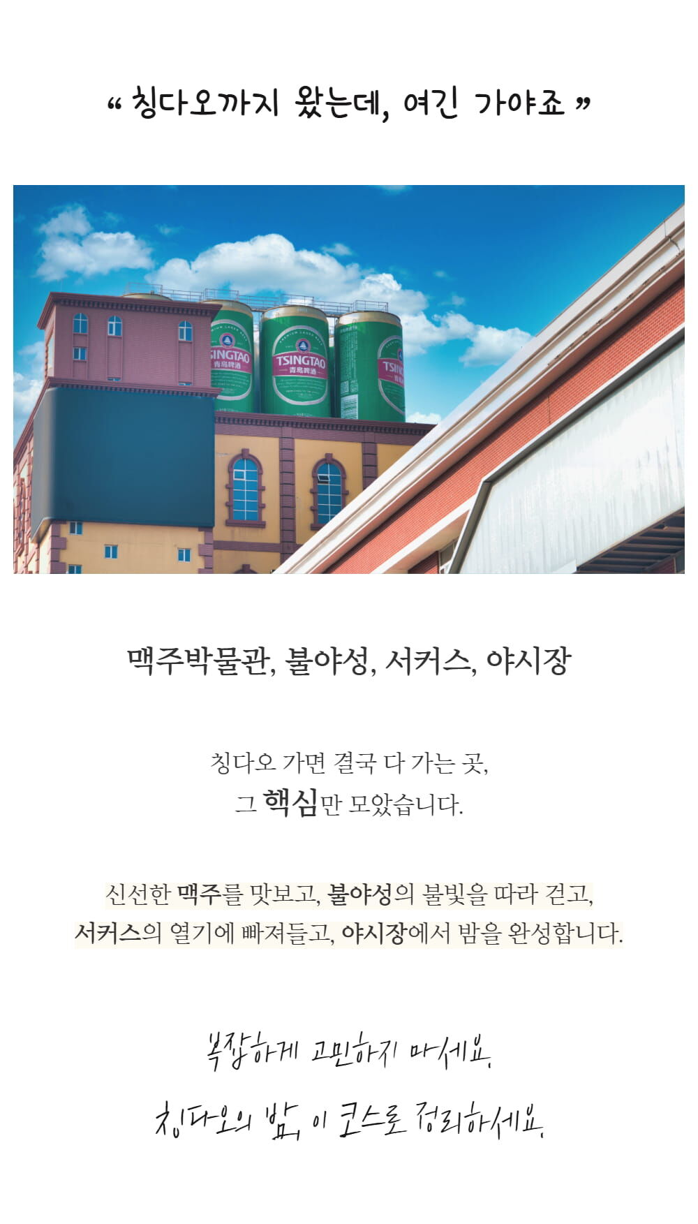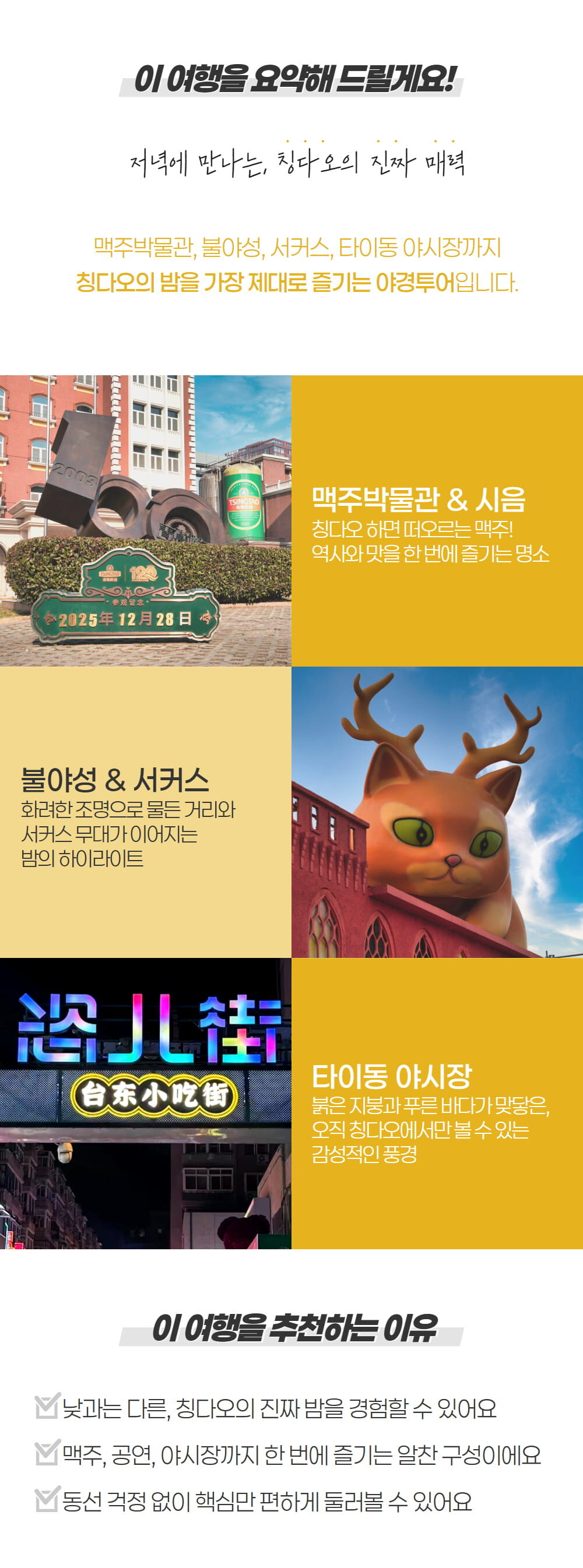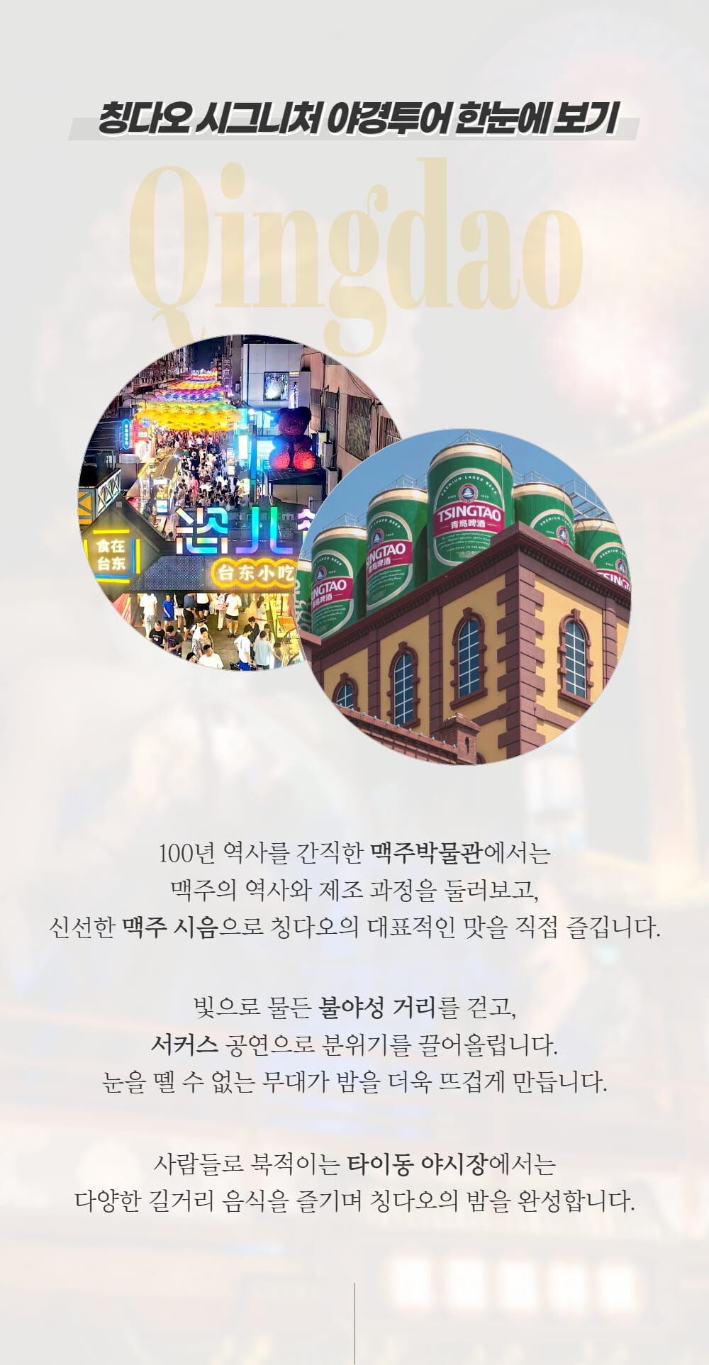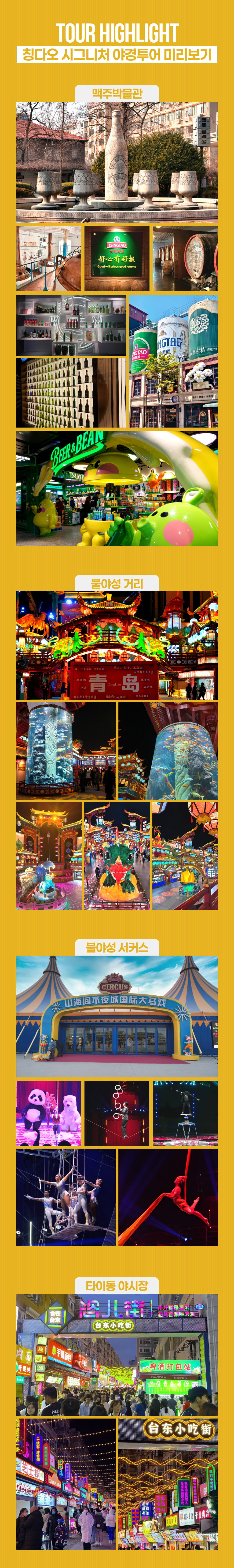 칭다오 시그니처 야경투어 [맥주박물관&불야성&서커스&타이동야시장 포함] :: 중국/칭다오 평점 5 · 리뷰 3건 포함 한국어 안내 가능 가이드, 관광지 입장료, 전용 차량(차량크기는 행사당일 진행확정 인원수에 따라 배정됩니다) 불포함 개인경비, 식사비용(석식), 여행자보험, (기본적인)준비물 마이리얼트립에서 예약하기 하남 목록 도시 목록