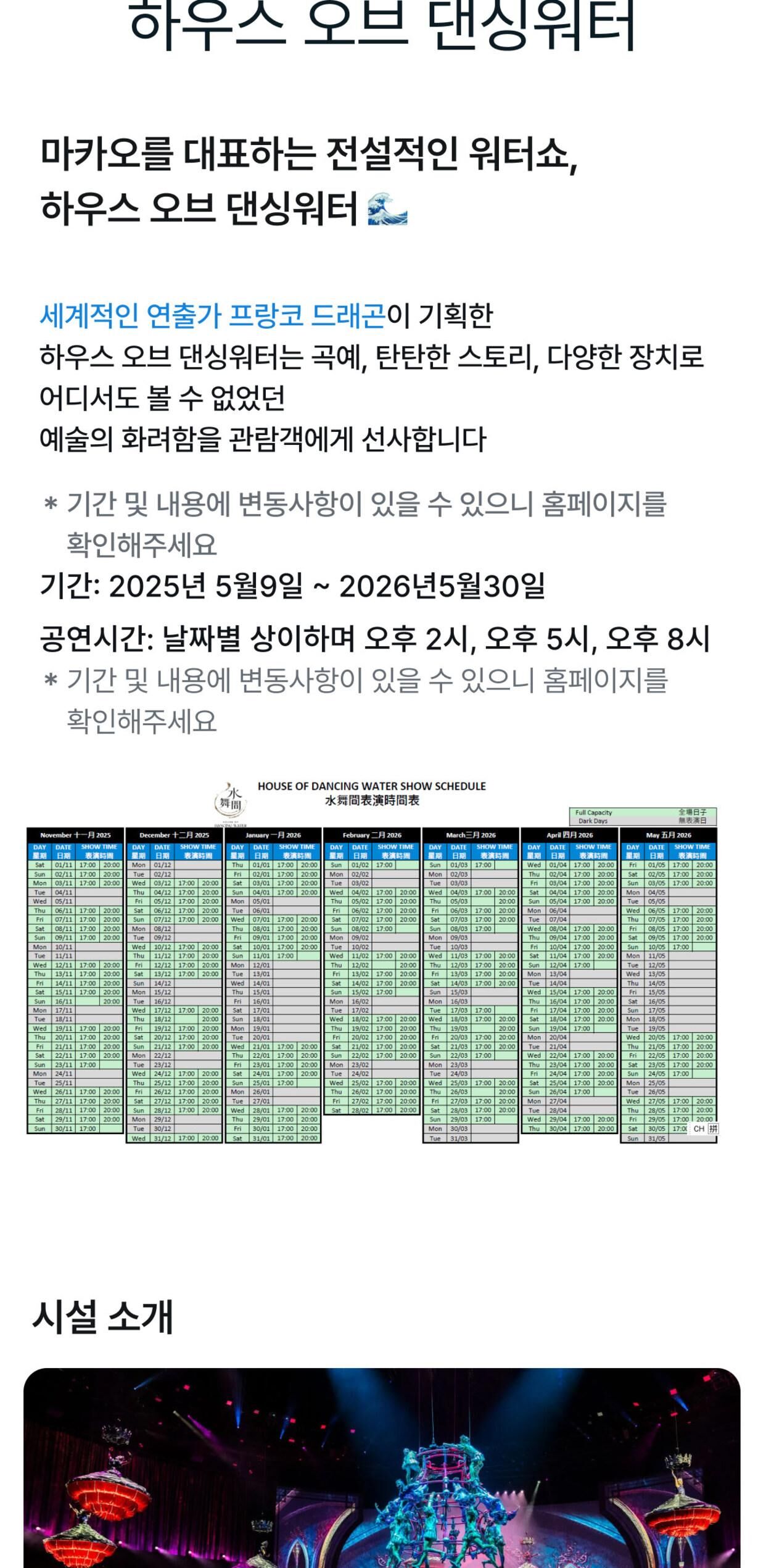 마카오 더 하우스 오브 댄싱워터 쇼 입장권 (2인 이상) 평점 5 · 리뷰 2건 포함 • 쇼 입장권 불포함 상품 설명을 참고해주세요. 마이리얼트립에서 예약하기 마카오 목록 도시 목록