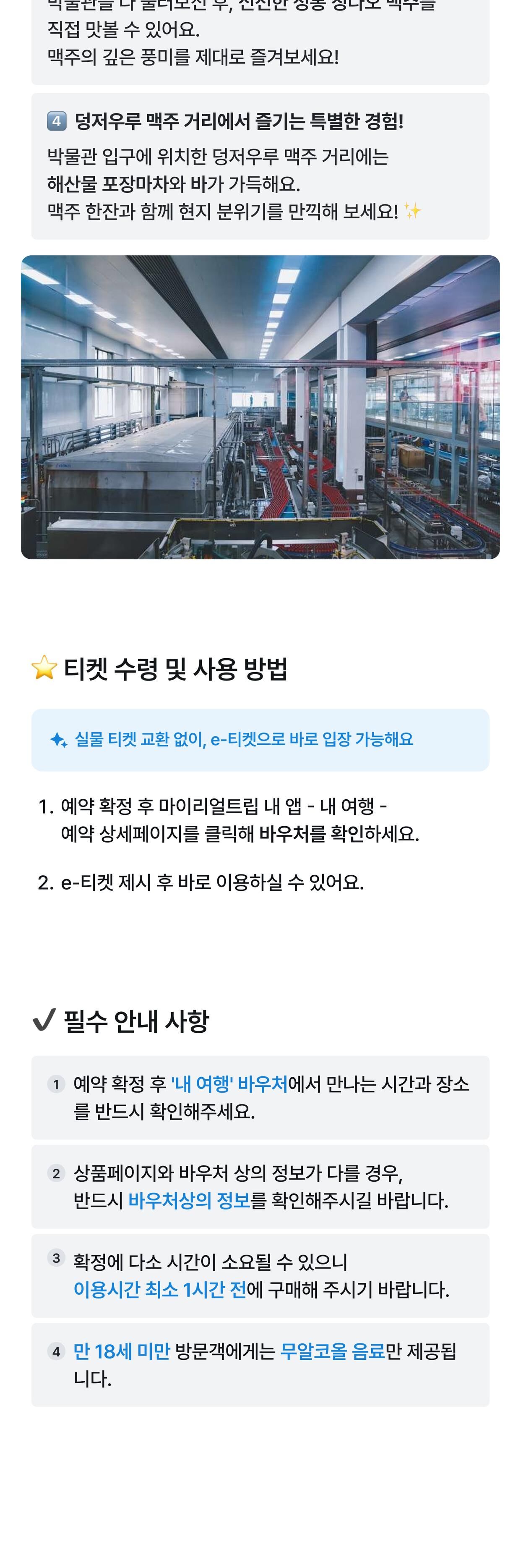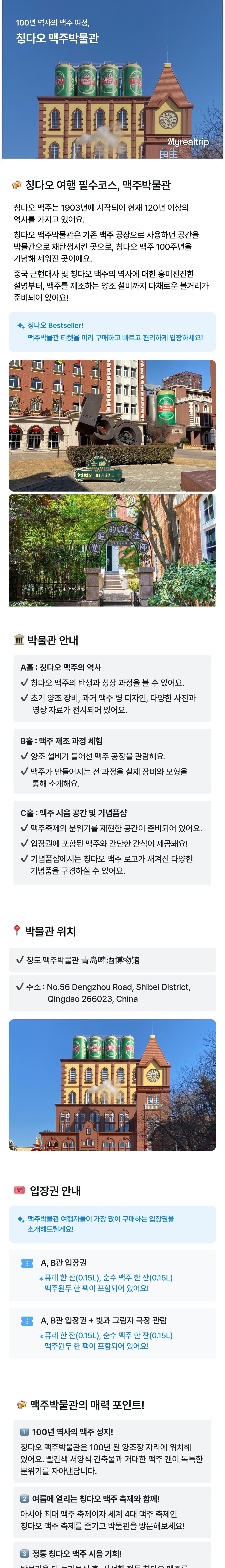 🍺칭다오 맥주박물관 입장권 성인권 - (맥주2잔 포함) 평점 4.5744680851064 · 리뷰 47건 포함 • 칭다오 맥주 박물관 듀얼 홀(홀 A+B) 티켓 • 원맥 한 잔(0.15L) + 생맥주 한 잔(0.15L) + 땅콩(안주) 한 팩 [추가 정보] - 미드웨이 바에서 원맥 한 잔, 뮤직 바에서 생맥주 한 잔(0.15L) - 18세 미만 방문객에게는 무알코올 음료만 제공됩니다. 무알코올 음료 2잔 + 안주 땅콩 한 팩 불포함 • 그 외 개인 경비 마이리얼트립에서 예약하기 칭다오 목록 도시 목록