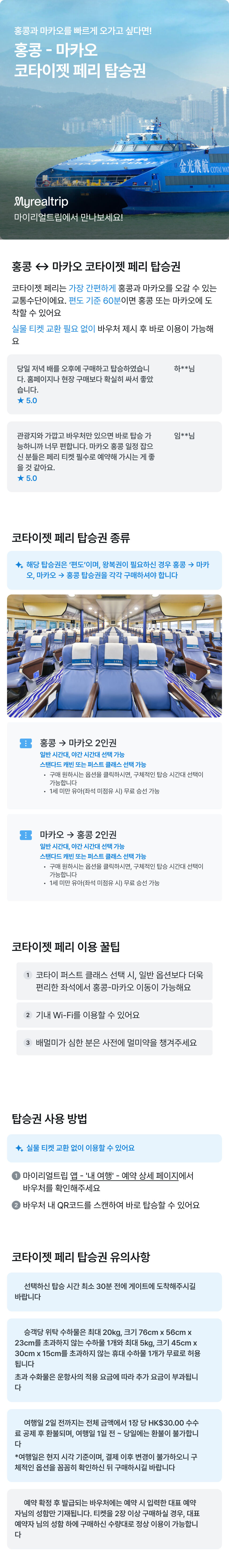 [2인권] 마카오 - 홍콩 코타이젯 페리 탑승권 평점 4.5844155844156 · 리뷰 77건 포함 각 주문에는 홍콩-마카오 페리 터미널(마카오 타이파 터미널에서 홍콩 홍콩-마카오 터미널까지) 편도 선박 티켓 2매(좌석 지정 불가)가 포함됩니다. 불포함 모든 개인 경비 및 비용 포함 사항에 언급되지 않은 기타 비용 마이리얼트립에서 예약하기 마카오 목록 도시 목록
