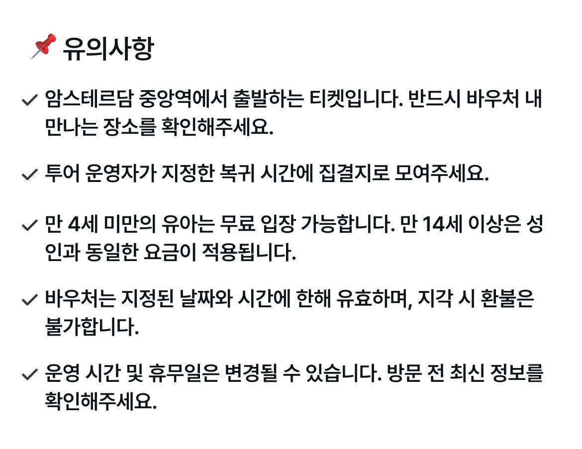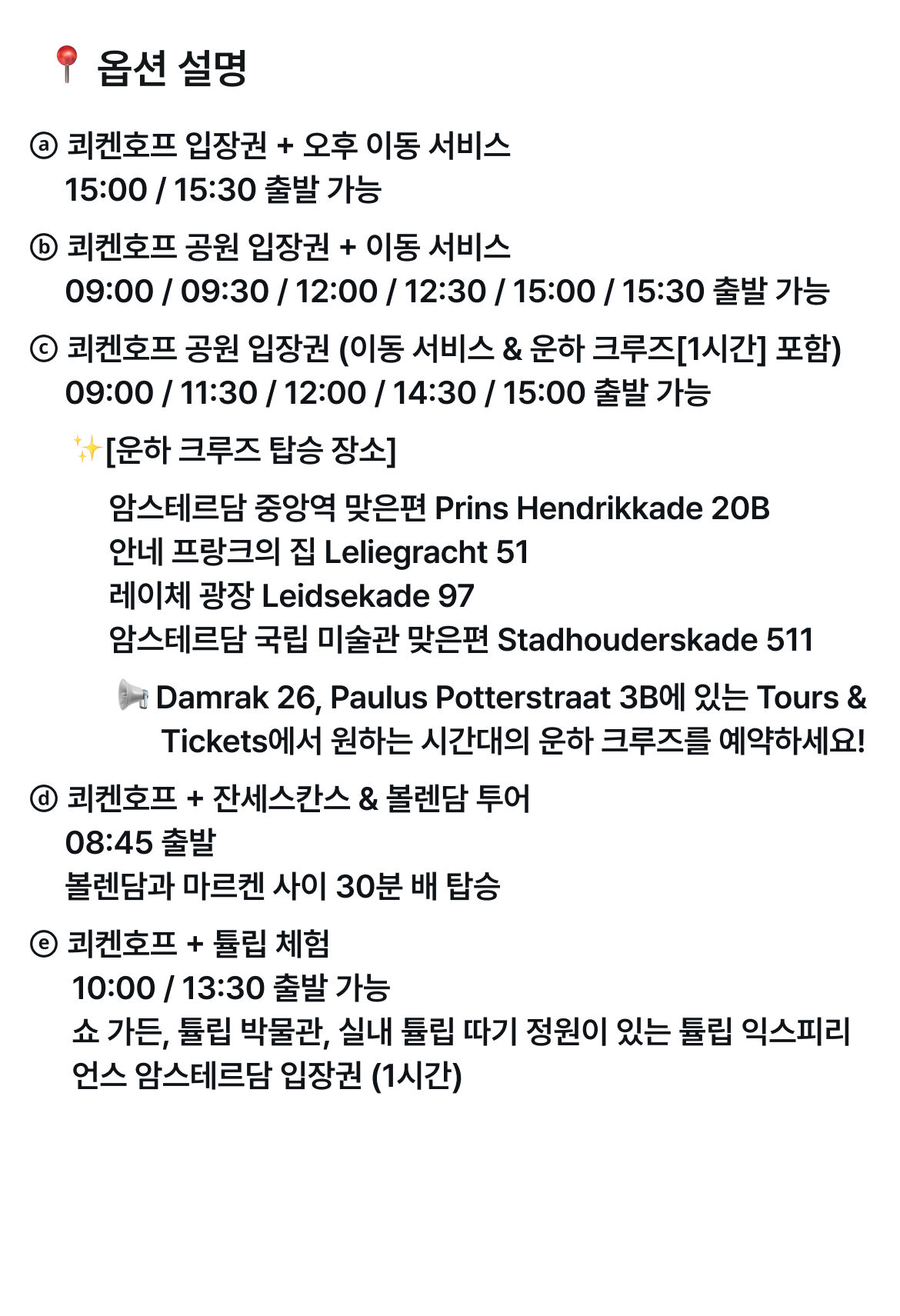 - 쾨켄호프 패스트트랙 티켓 미팅 장소 왕복 이동 서비스 차내 와이파이 버스 오디오 가이드(해당 옵션 선택 시) 암스테르담 운하 크루즈(해당 옵션 선택 시) 잔세스칸스 풍차 관람(해당 옵션 선택 시) 볼렌담 & 마르켄 내 전통 네덜란드 문화 체험(해당 옵션 선택 시) 볼렌담 & 마르켄 간 30분 보트 투어(해당 옵션 선택 시) 1940년대 마커 가정 방문(해당 옵션 선택 시) 쇼 가든, 튤립 박물관, 실내 튤립 따기 정원이 있는 튤립 익스피리언스 암스테르담 입장권(해당 옵션 선택 시)