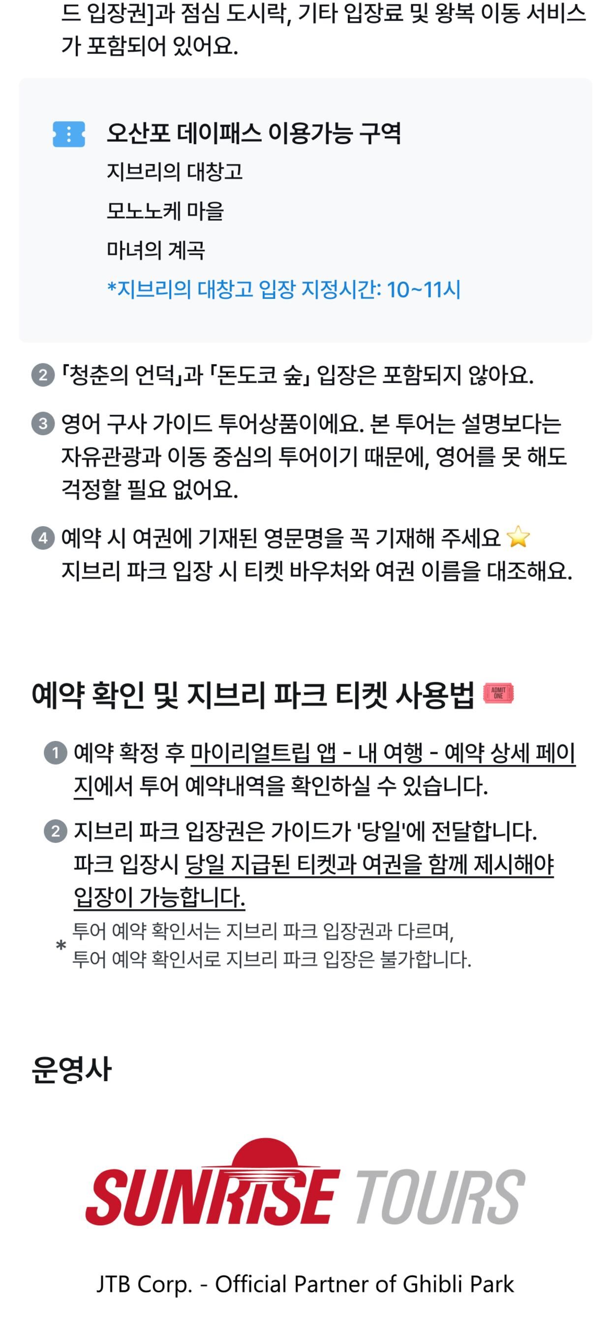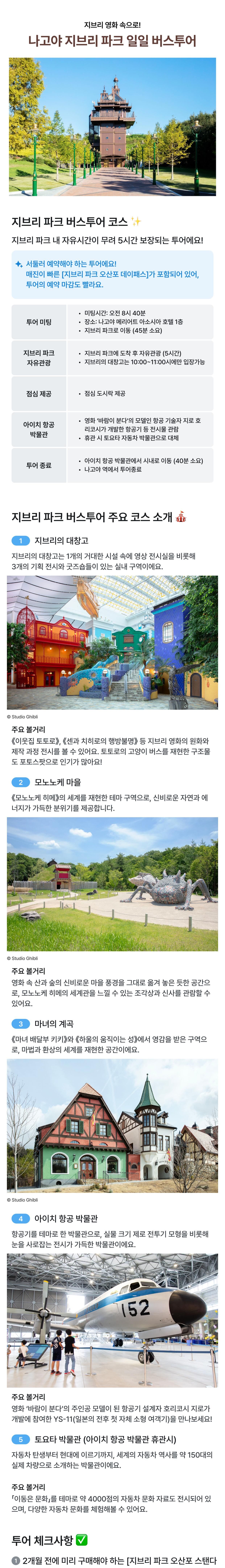 - • 지브리 파크 오산포 데이 패스 (지브리 대창고, 청춘의 언덕, 돈도코 숲, 모노노케 마을, 마녀의 계곡 구역 입장 가능) • 아이치 항공 박물관 입장 • 영어를 구사하는 투어 가이드 • 점심 식사 (도시락 및 음료)제공 • 왕복 이동 서비스 • 기타 일정에 포함된 입장료 및 교통비