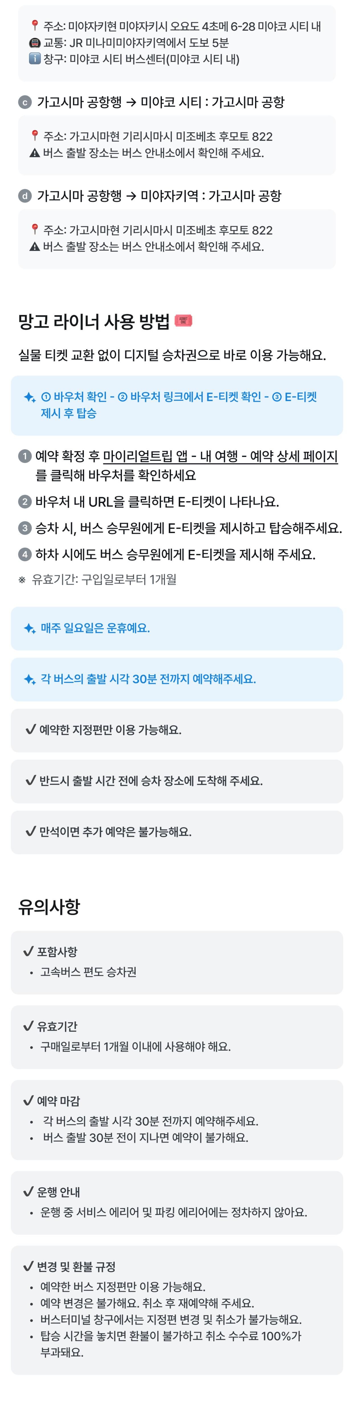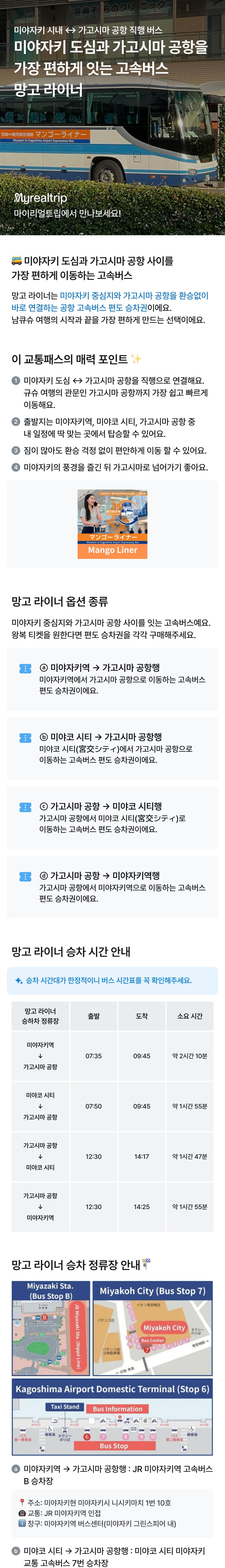 미야자키역 & 미야코 시티 ↔ 가고시마 공항 망고 라이너 편도 티켓 평점 5 · 리뷰 1건 포함 • 승차권 불포함 상품 설명을 참고해주세요. 마이리얼트립에서 예약하기 미야자키 목록 도시 목록