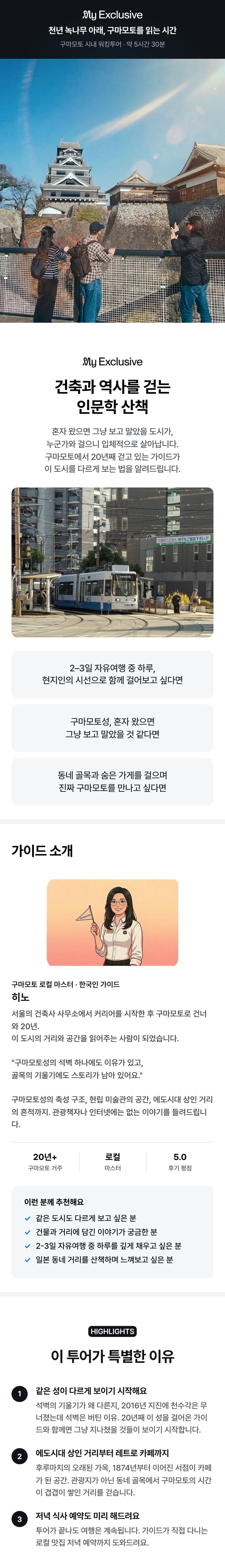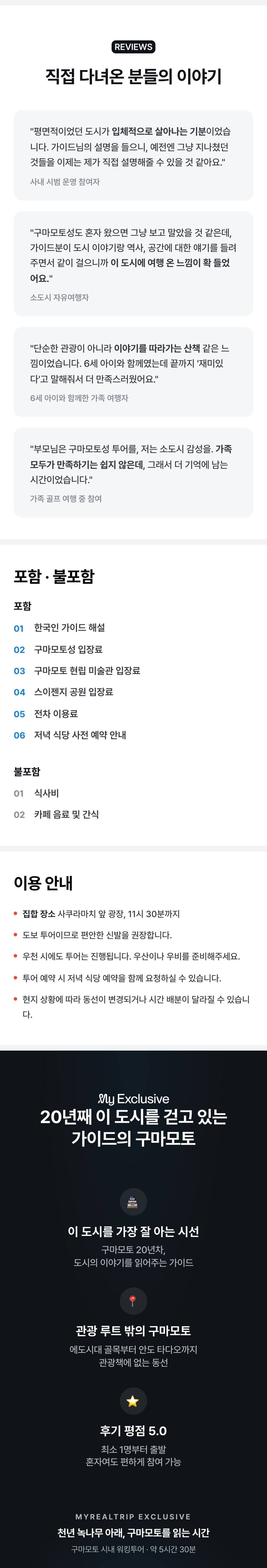 한국인 가이드가 소개하는 구마모토 시내 워킹투어 (로컬 맛집·카페 큐레이션) 평점 5 · 리뷰 9건 포함 가이드 해설 구마모토성 입장료 구마모토 현립 미술관 입장료 스이젠지 공원 입장료 저녁 식당 사전 예약 안내 불포함 개인 경비(음료 및 간식 구입비 등), 여행자 보험 마이리얼트립에서 예약하기 구마모토 목록 도시 목록